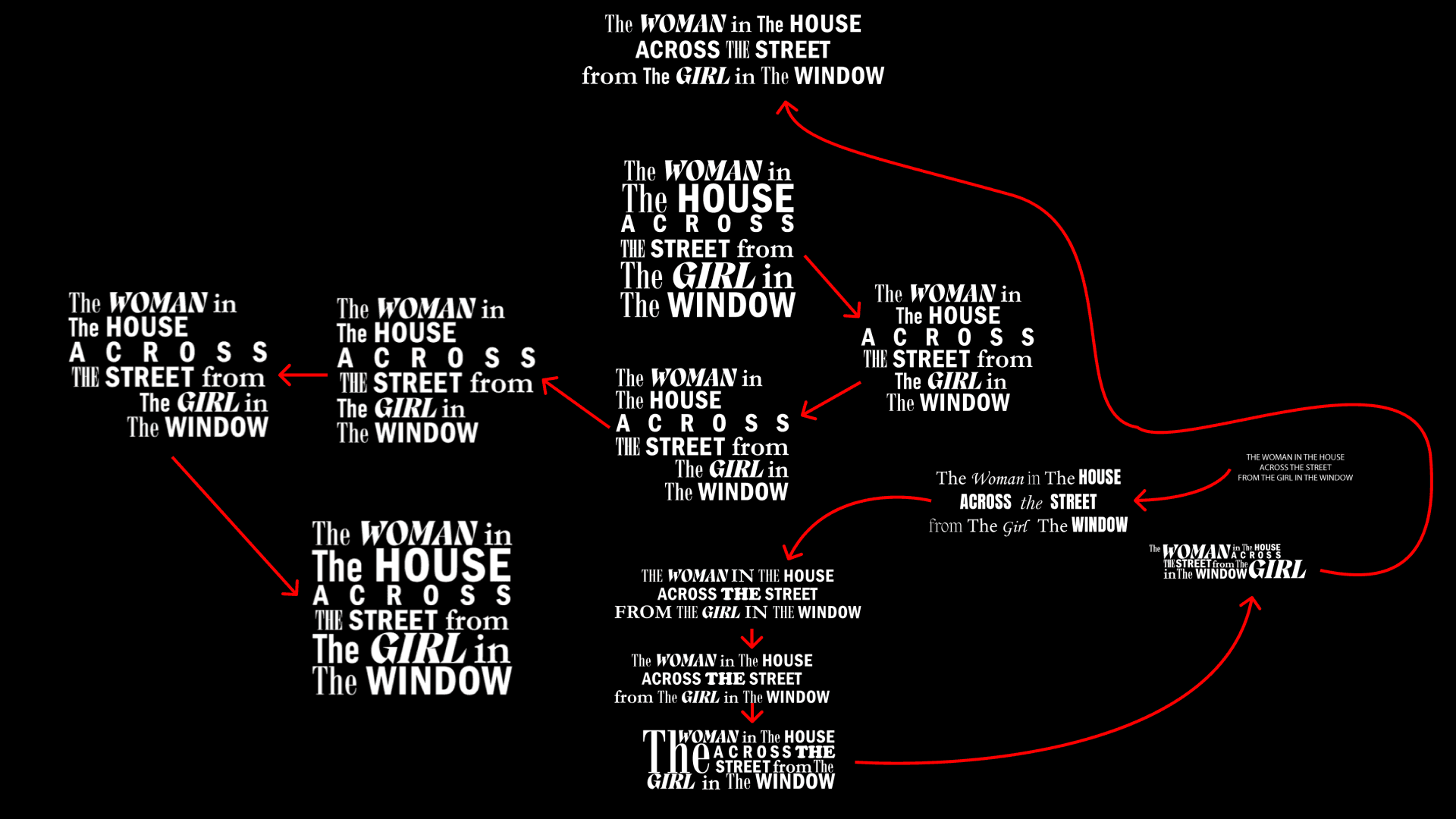A Typography project focused towards creating a multi-typeface title screen for the Netflix series: The Woman in the House Across the Street from the Girl in the Window, using 6 or more different typefaces to create 2 different layouts, 1 vertical and 1 horizontal.